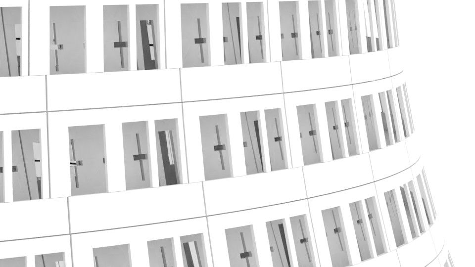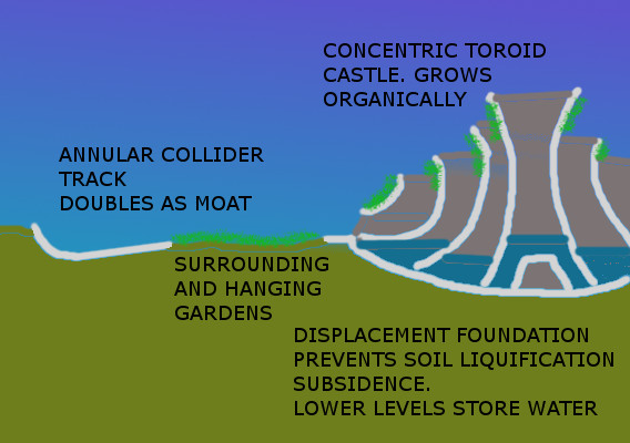 The shells are surrounded by a collider track with an open inner surface. This will double as a moat and, when combined with the concentric towers, forms a highly defensible fortification, increasing the cost of exploiting the poor.