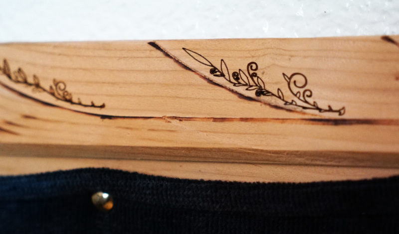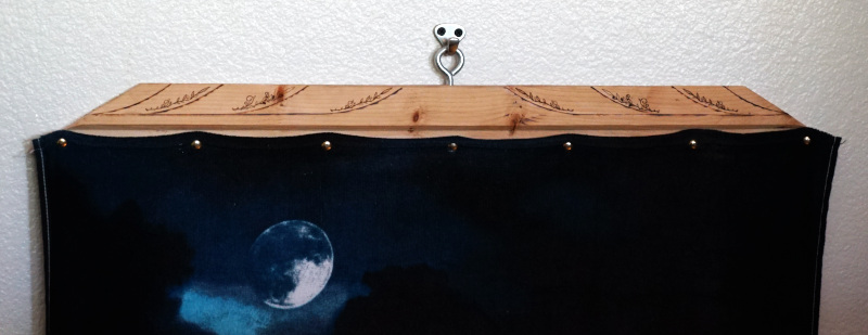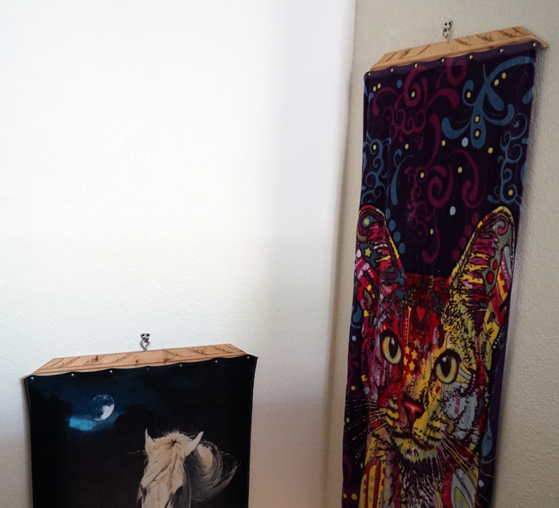"TryopTowelHanger-H6-W32-FC-MH-IE2" (A hanger 5.5" tall and 32" wide, with two eye-bolts, made of hardwood and with unspecified custom artwork, approx $75 each)